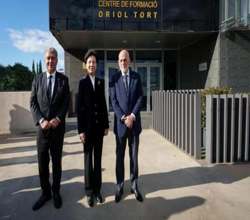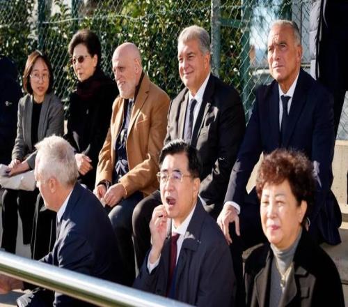 巴塞罗那足球俱乐部主席拉波尔塔与西甲联盟主席特巴斯,共同欢迎由中国国务委员谌贻琴率领的中国代表团访问巴萨拉玛西亚青训营。